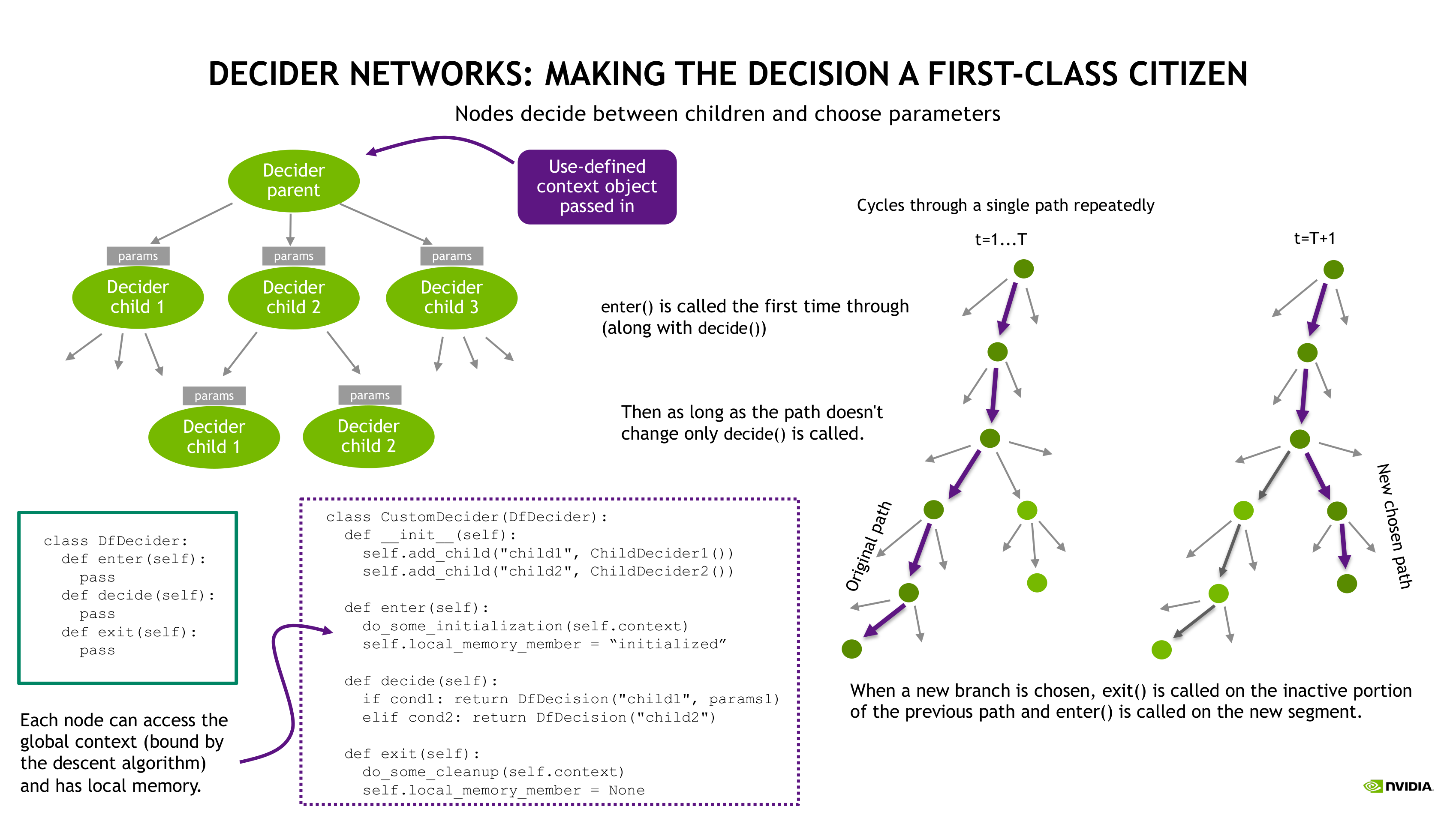 the same decisions as before, or making different decisions. Each decide node has an enter() and