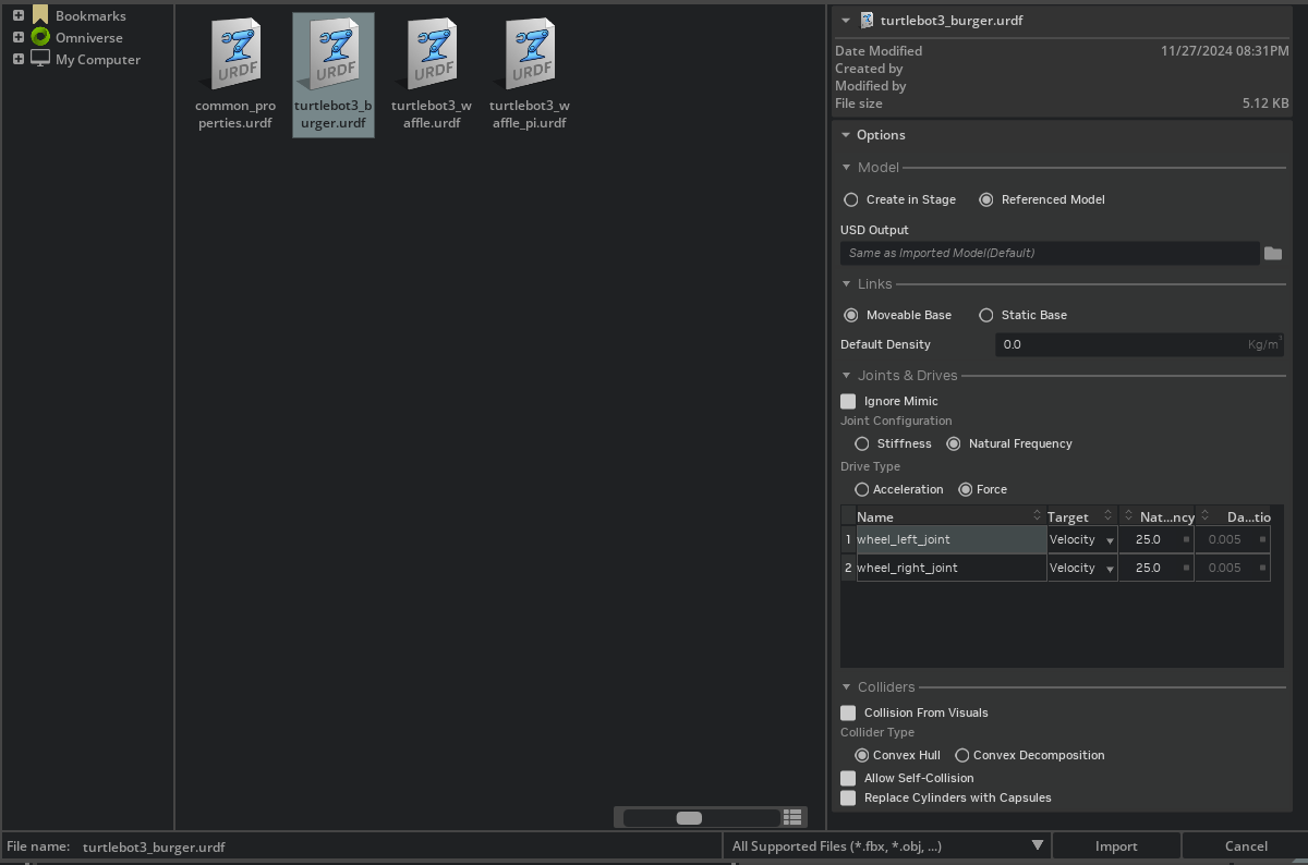 In the prompt window, select Referenced Model. Inside the Links section, set to Moveable Base. Since this is a mobile robot, change targets of wheel_left_joint and wheel_right_joint to Velocity under the Joints & Drives section so that wheels can be properly driven later.