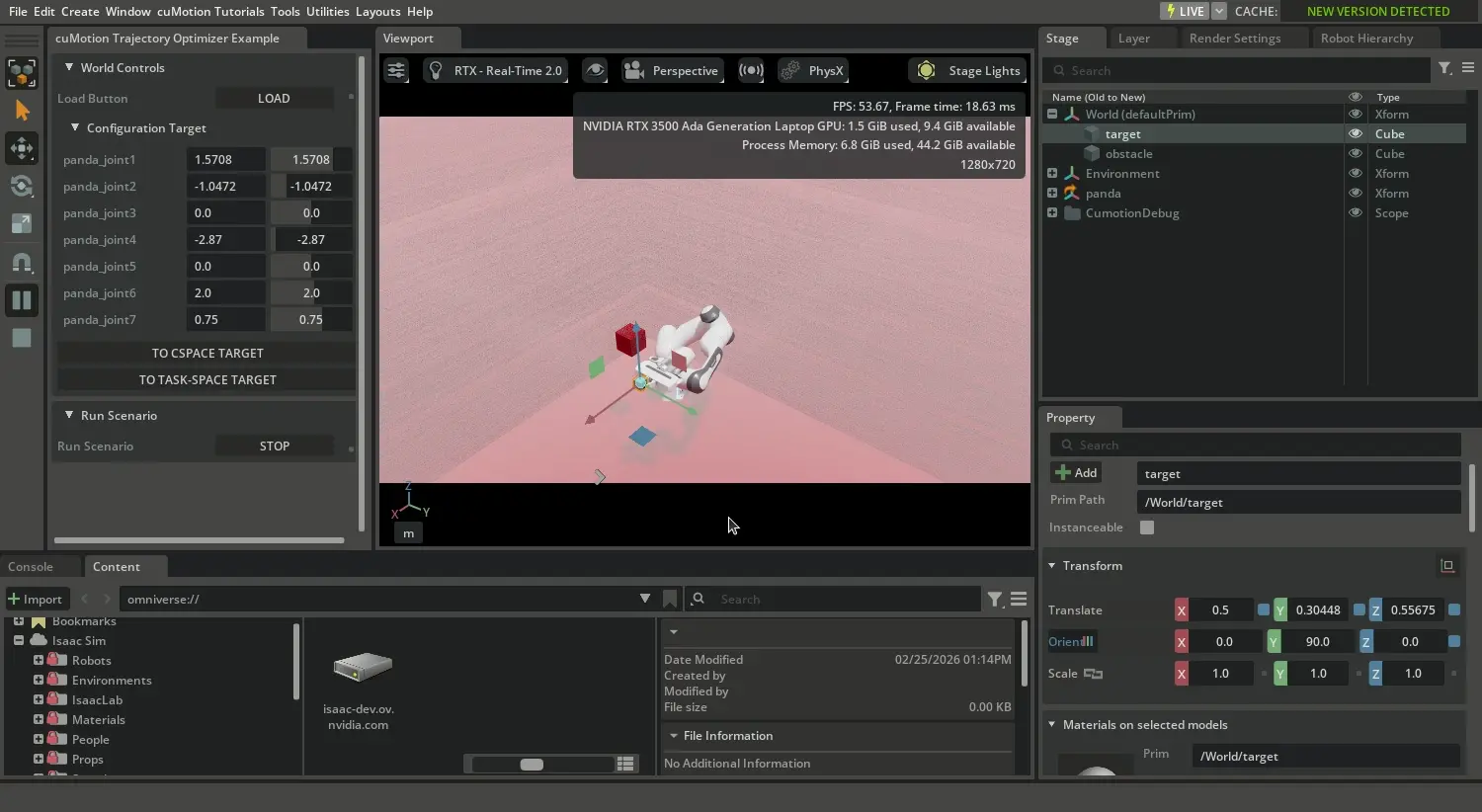 This tutorial covers the basic usage of the TrajectoryOptimizer for configuration space and task-space targets. The cuMotion library provides many additional capabilities including task-space goalsets, path constraints, axis constraints, and advanced optimization parameters. For complete documentation of all available features, see the official cuMotion Python and C++ API documentation.