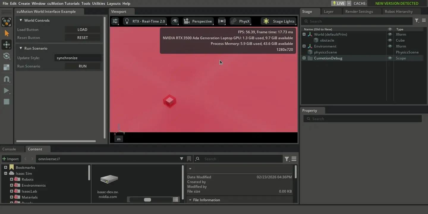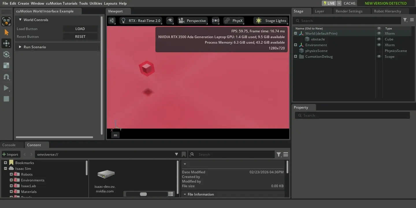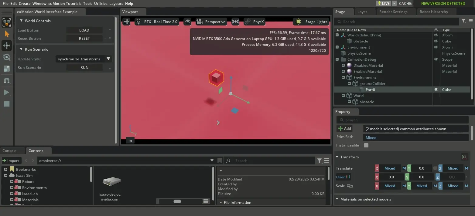This tutorial provides an interactive environment for experimenting with the CumotionWorldInterface. Here are some ways to explore the tutorial