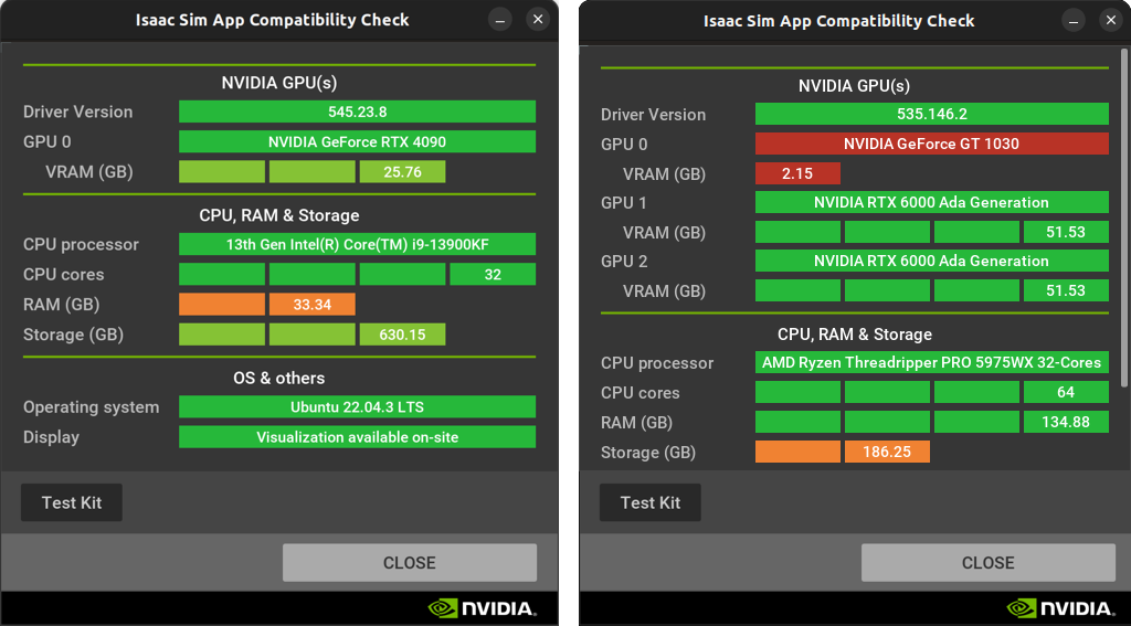 The Isaac Sim Compatibility Checker is a lightweight application that programmatically checks the above requirements and indicates which of them are valid, or not, for running NVIDIA Isaac Sim on the machine.