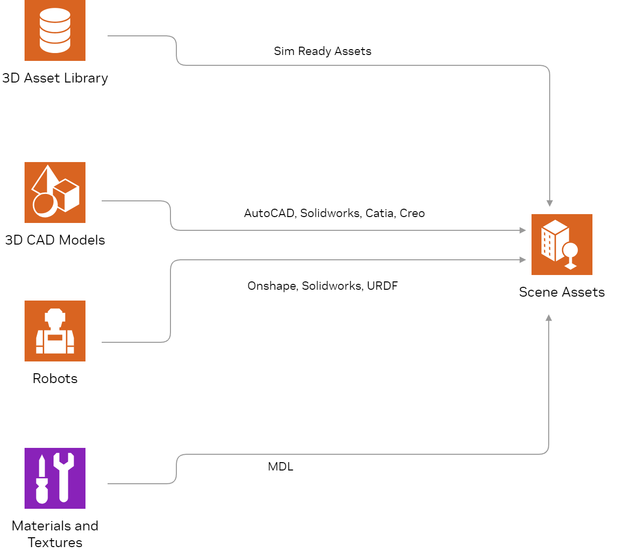 The asset importer can be leveraged for importing OBJ, FBX, and glTF formats. The CAD converter extension supports a variety of popular CAD files from applications including Catia, Solidworks, AutoCad, and Creo. This enables you to quickly convert and import your environment into Isaac Sim.