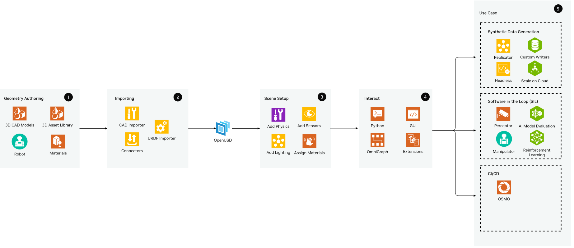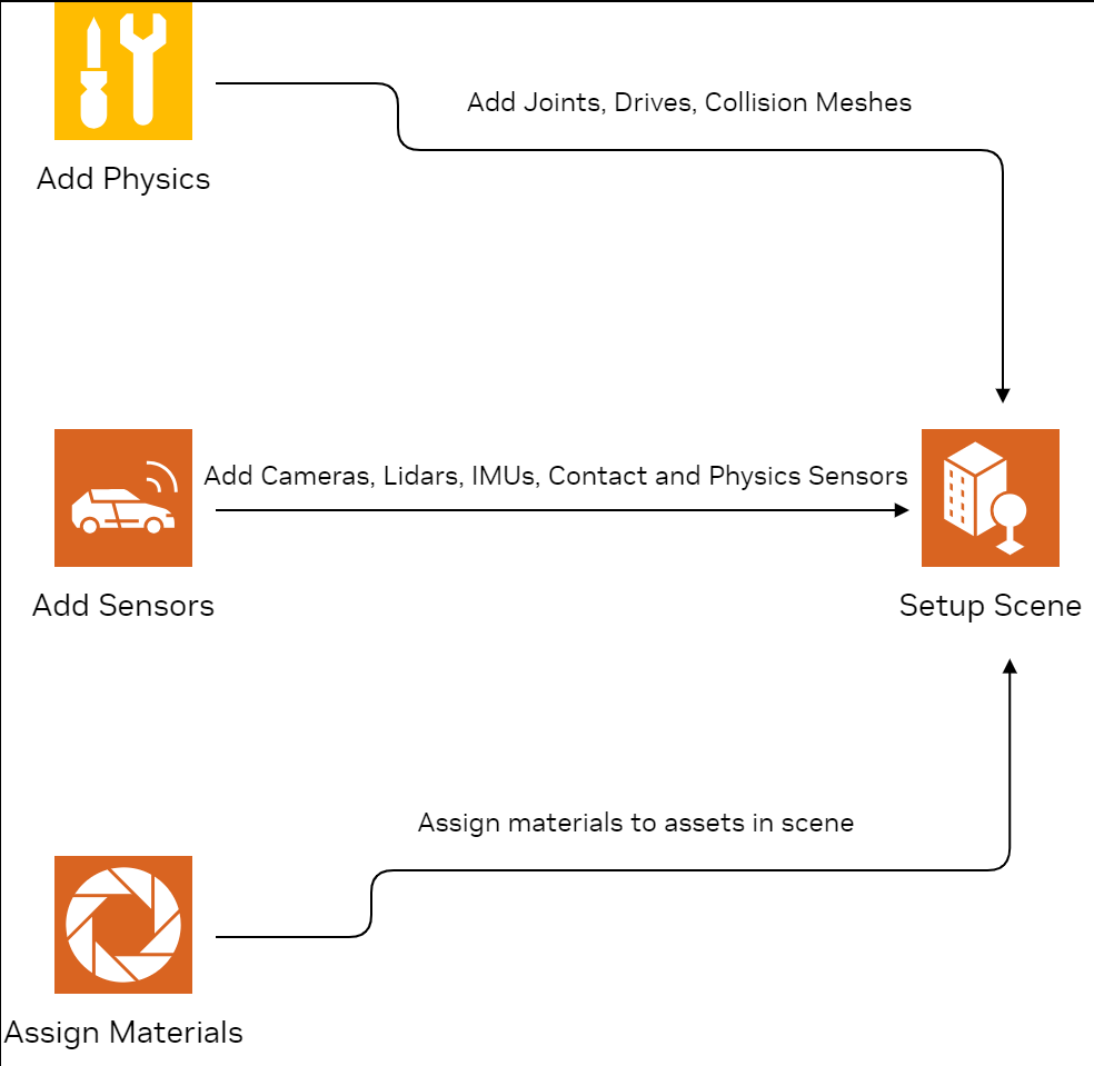 Regardless of your product components, most Isaac Sim use cases involve the following high level task groupings that occur in roughly the same order: