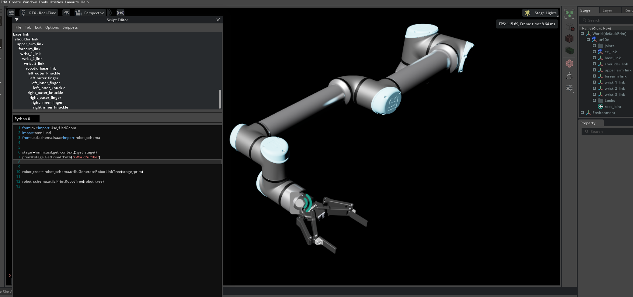 Note how the gripper is included in the robot structure, even though it is not part of the UR10e robot. Select the UR10e prim on the stage, and check how the Robot Lists have ee_link listed.