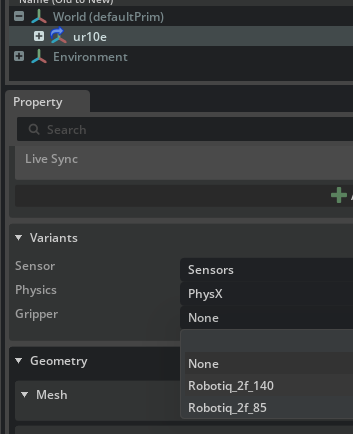 On the Variant selection menu at the properties panel, select the Robotiq 2f-140 gripper variant.