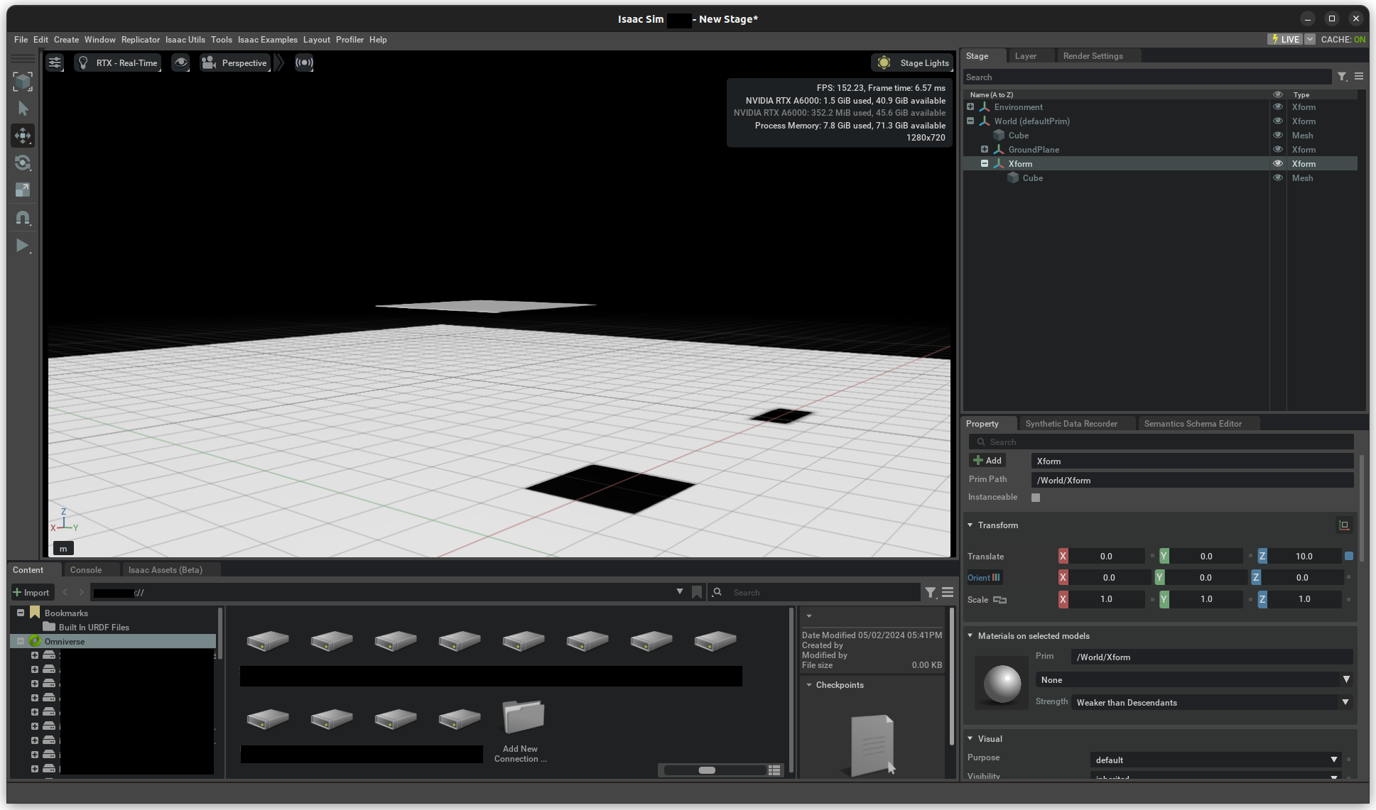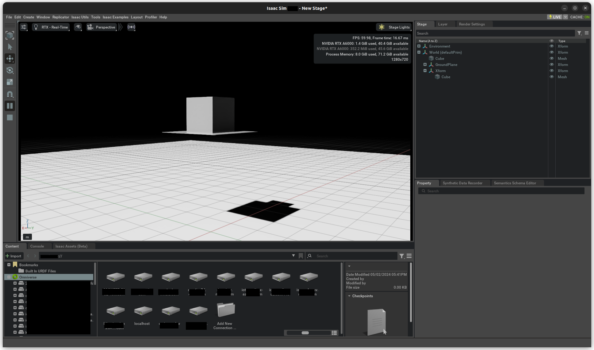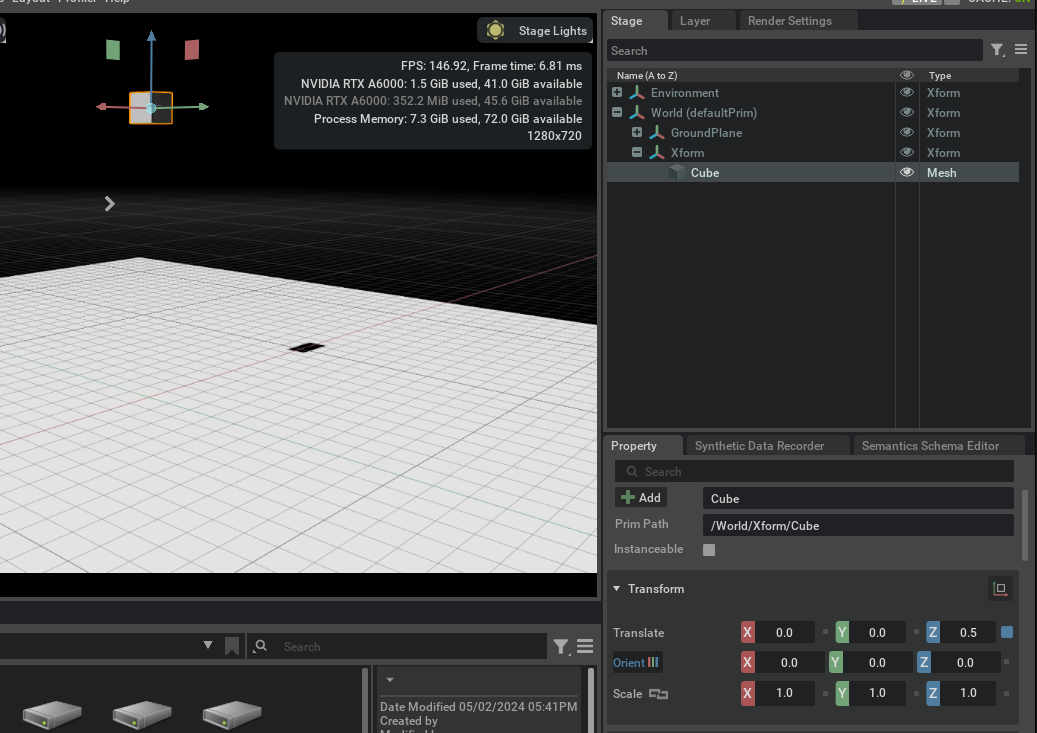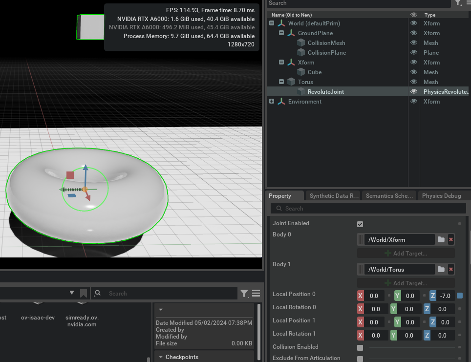 Prims in a USD stage do not have physics enabled by default, but you may add simulation properties through the UI or using Python scripts. The following creates an example scene to which elements are added as we progress through the basic physics object types.