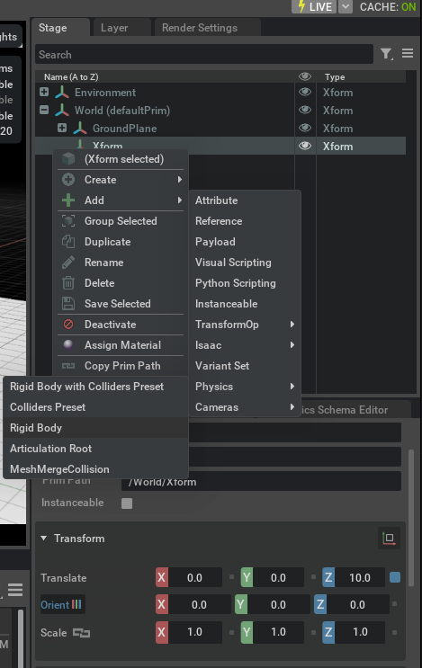 Verify that the Xform is now be a rigid body, although you may not see much because it has no visual meshes.