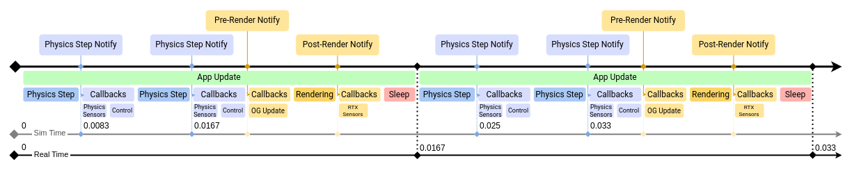 There are three event streams on the timeline (among a few others, but these are notably the most relevant for Isaac Sim). You can subscribe directly to Simulation Events or to Frame update events, either pre or post-rendering. OmniGraph nodes are typically updated on a pre-render event, but there are ways to set them to update on different events, such as every physics step.