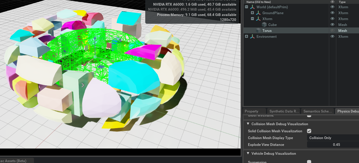 You can also view a solid display of the colliders by opening the Physics debug menu: 1. Window > Simulation > Debug. 2. In the debug window, scroll to “Collision Mesh Debug Visualization”. 3. Check “Solid Mesh Collision Visualization”. 4 Verify that when you select the torus, its shape displays solidly.