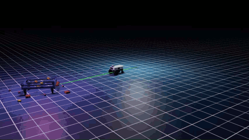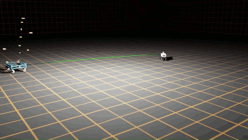 _randomize_dolly_pose: places the dolly at a random pose with a given minimum distance from Nova Carter. After such a pose is found, the navigation target is placed at the dolly’s position._randomize_dolly_light: places the dolly light above the dolly with a new random color._randomize_prop_poses: places the props above the dolly at random locations, which eventually starts to fall after the simulation starts.
