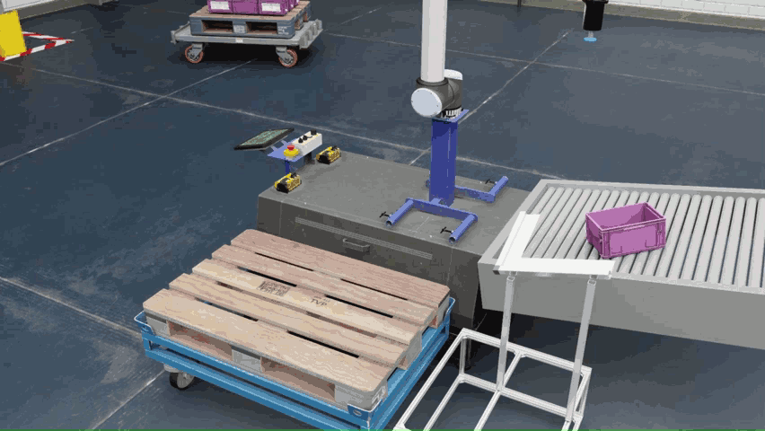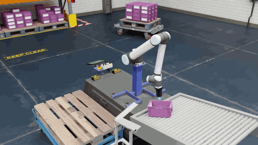 For this tutorial, you build on top of the UR10 palletizing demo scene, which is programmatically loaded and started by the provided script.