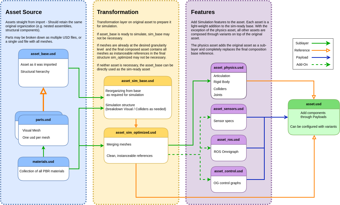 Simulation features are added in this stage and each feature is defined as a separate lightweight layer that builds on top of the transformed asset. These features include, but are not limited to, physics setups, sensor configurations, and control graphs.