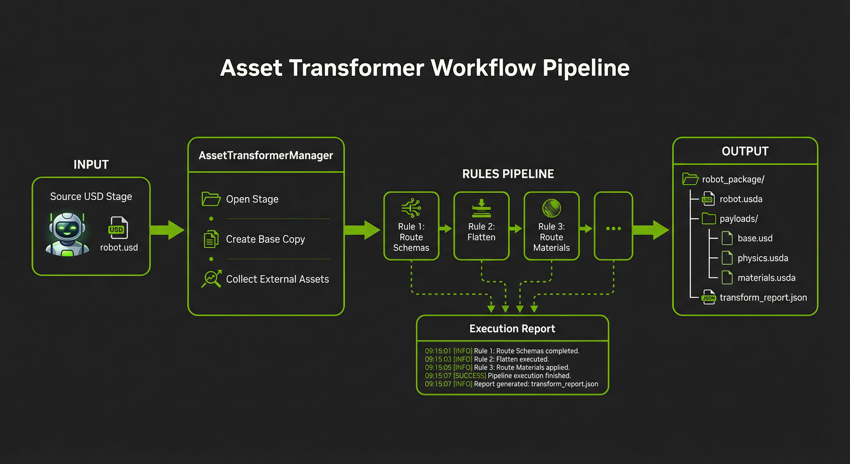 The Asset Transformer is a framework for transforming USD assets in Isaac Sim. It provides utilities for batch transforms, schema routing, mesh deduplication, material optimization, and structural reorganization. The transformer operates through a rule-based pipeline where each rule performs a specific transformation on the USD stage, enabling complex multi-step asset optimization workflows.