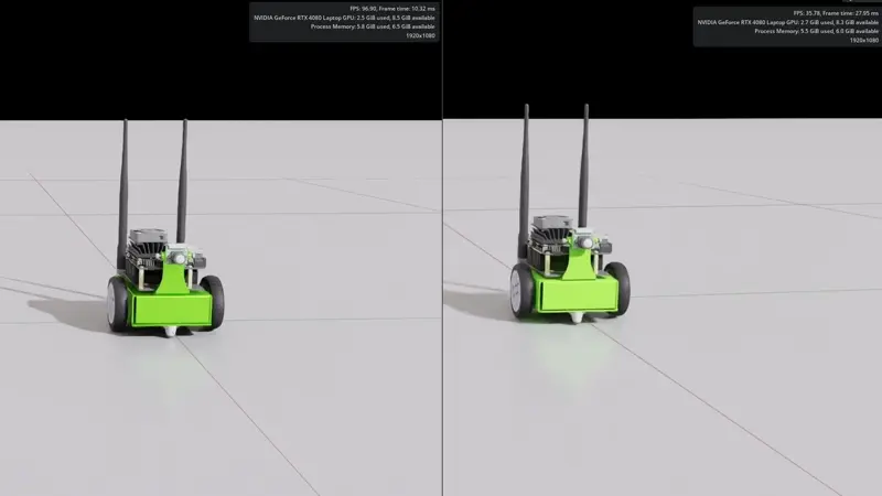 From the recording of this Jetbot asset imported from CAD that on the right side we have an unoptimized asset, and it’s achieving 40 FPS, while the asset on the left was optimized, and now achieves 64 FPS.