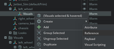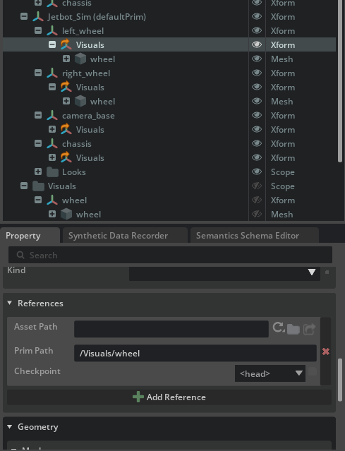Jetbot_Sim/right_wheel/Visuals.Under the References section of the Property panel, replace the reference Prim Path from