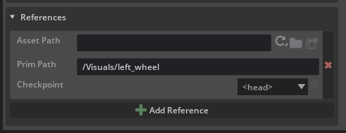 /Visuals/left_wheelprim, which you just added a reference onto. Then in the Property panel, scroll down to the References section. The prim path is in red, select the Asset Path entry and clear it.This will make the reference point to the internal