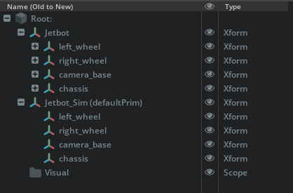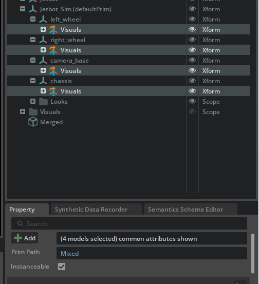 /Jetbot_Simand check Instanceable in the Property panel.On the Visuals prims, notice the reference icon now has a blue “I” on it. This indicates they are instantiable meshes and effectively applying any memory savings.