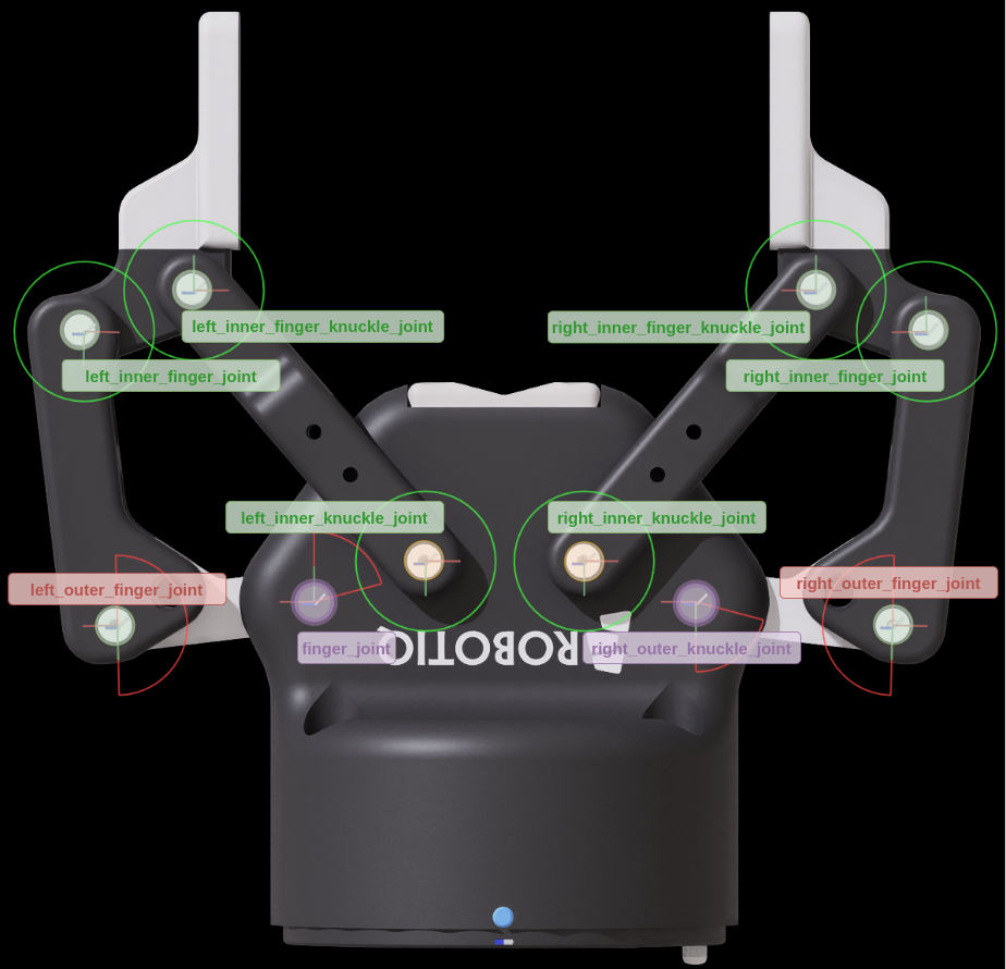 In the case of this gripper, the best option to remove from the articulation are the joints that connect the inner shafts to the gripper body - the inner_knuckle_joint - highlighted in orange in the image.