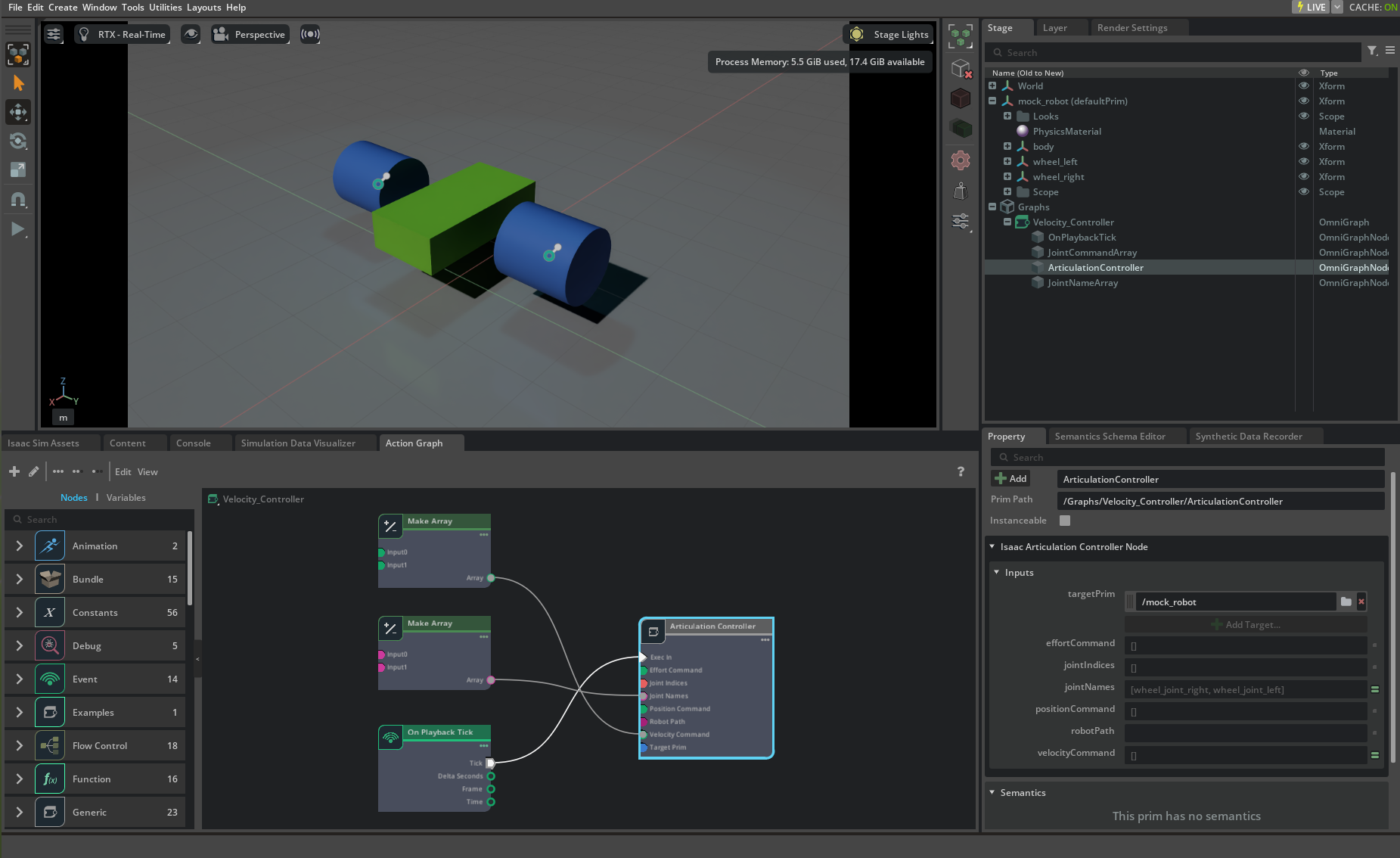 JointCommandArrayon the stage tree under /Graphs/velocity_controller, and change the parametersinput0andinput1in the properties window.