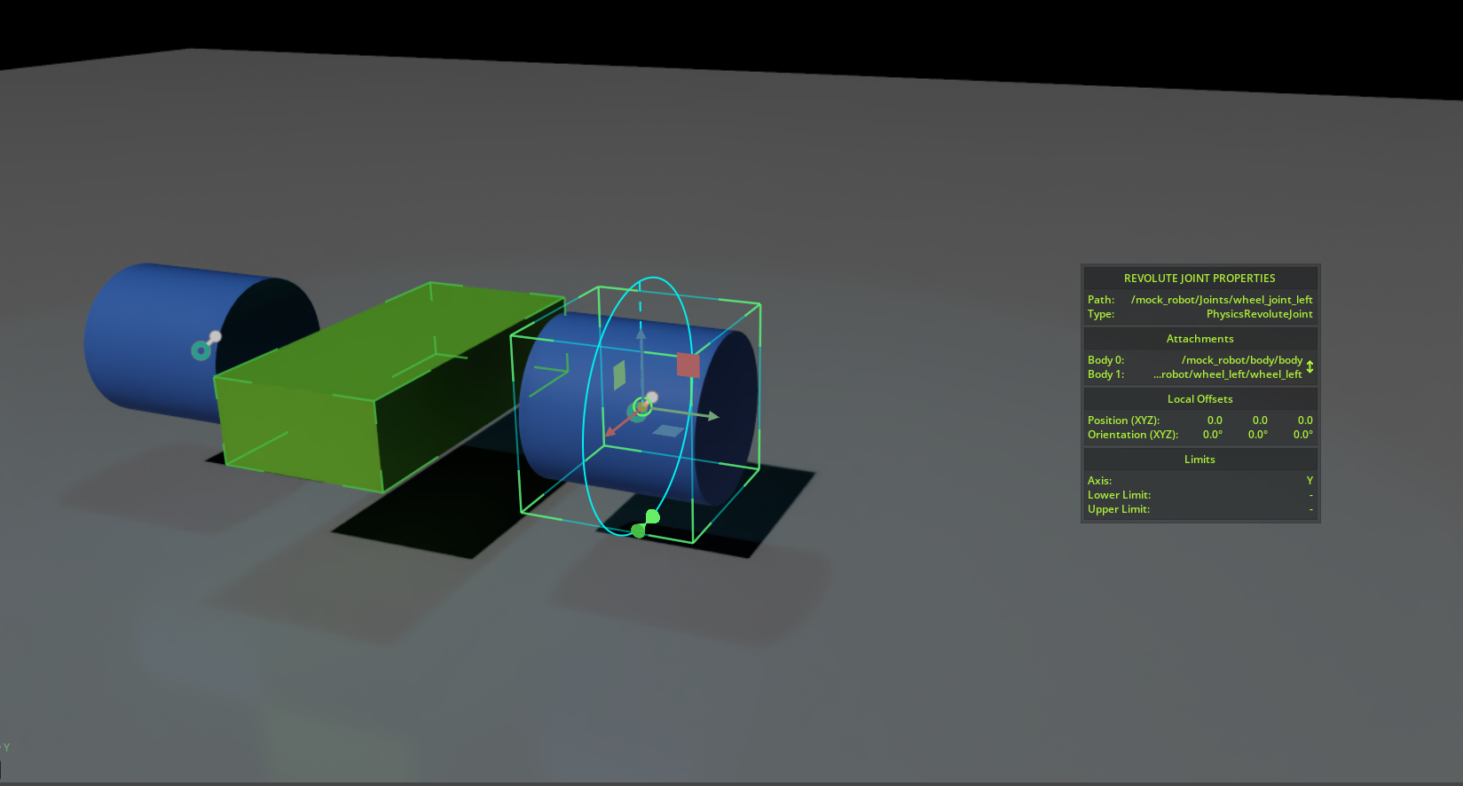 body, then while holdingCtrl, select the cylinder objectwheel_left.With both bodies highlighted, right-click and select Create > Physics > Joints > Revolute Joint.