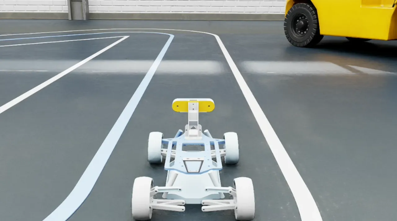 Open the Leatherback warehouse with race track scene by going to the Content Browser Isaac Sim>Sample>ROS2>Scenario>leatherback_ackermann.