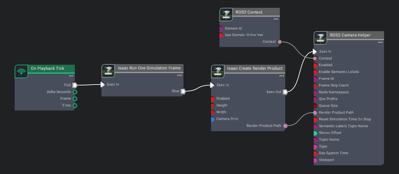 This graph is automatically created by the Camera Helper Node. The pipeline retrieves relevant data from the renderer, processes it, and sends them to the corresponding ROS publisher. This graph is only created in the session you are running. It will not be saved as part of your asset and will not appear in the Stage tree.