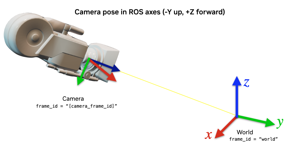 Enable isaacsim.ros2.bridge extension and set up ROS 2 environment variables following this workflow tutorial. Save the above script and run it using python.sh in the Isaac Sim folder. In our example, {camera_frame_id} is the prim name of the camera, which is floating_camera.