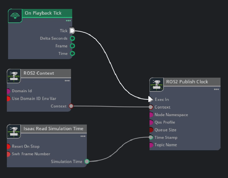 We provide a menu shortcut to build a clock graph within just a few clicks. Go to Tools > Robotics > ROS 2 OmniGraphs > Clock. If you don’t observe any ROS2 graphs listed, you need to enable the ROS2 bridge. A popup box will appear asking for the parameters needed to populate the graphs. Provide the graph path and click OK, verify that a graph publishing the simulated clock appears on the stage.