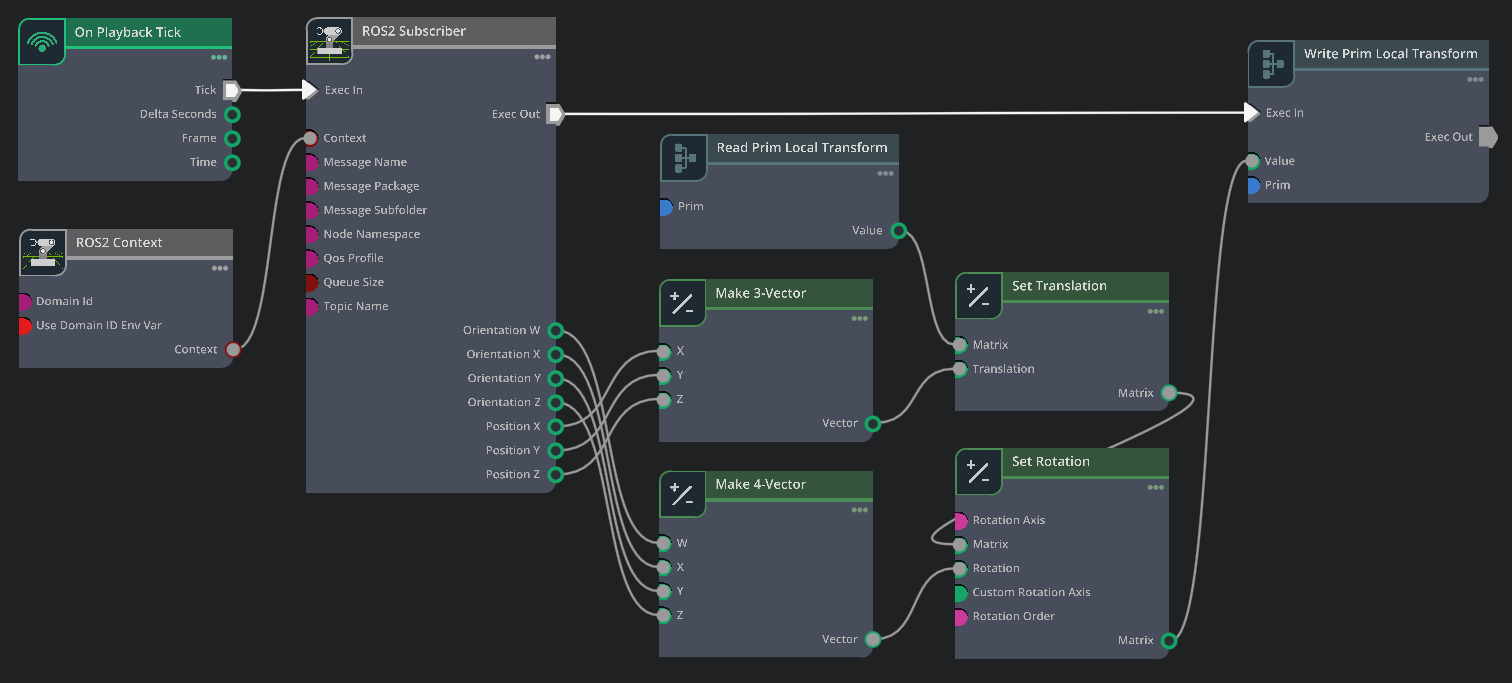 The following example shows how to create a subscription to the topic /object_pose, with the ROS 2 message type geometry_msgs/msgs/Pose, to teleport an object to the received pose using the generic ROS2 Subscriber node.