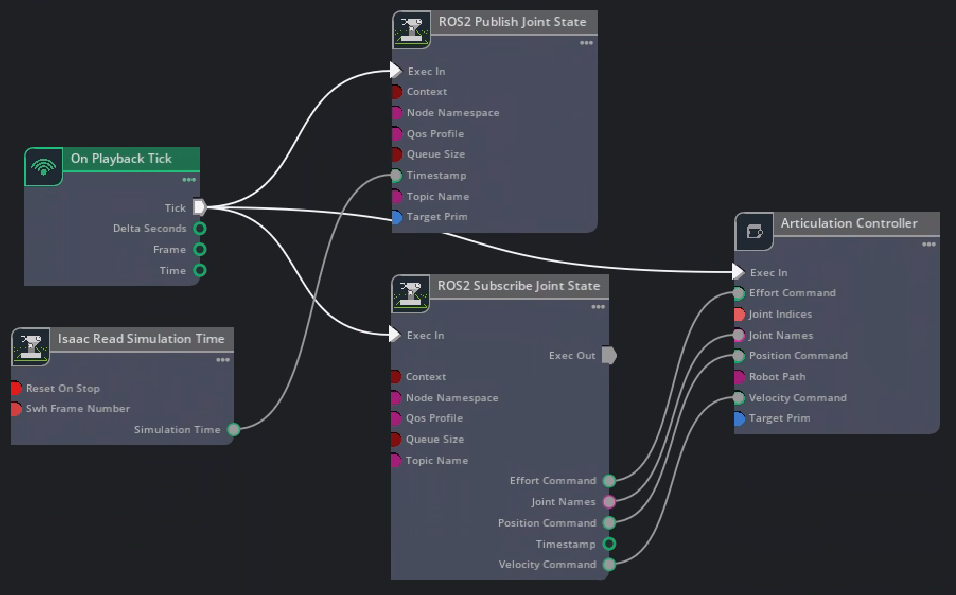Connect the Simulation Time output of the Isaac Read Simulation Time node to the Timestamp input of the ROS2 Publish Joint State node. Setup other connections between nodes as shown in the image below: