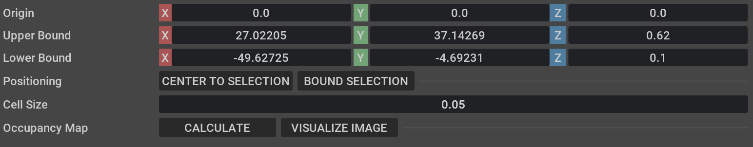 X: 0.0, Y: 0.0, Z: 0.0. For the lower bound, setZ: 0.1. For the Upper Bound, setZ: 0.62. Keep in mind, the upper bound Z distance has been set to 0.62 meters to match the vertical distance of the Lidar onboard Carter with respect to the ground.Select the Hospital prim in the stage. In the Occupancy Map extension, click on BOUND SELECTION. The bounds of the occupancy map should be updated to incorporate the selected Hospital prim.