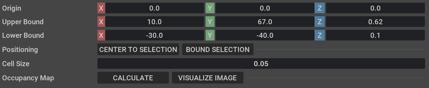 Go to Tools > Robotics > Occupancy Map. In the Occupancy Map extension, set the map parameters to be similar to the following image: