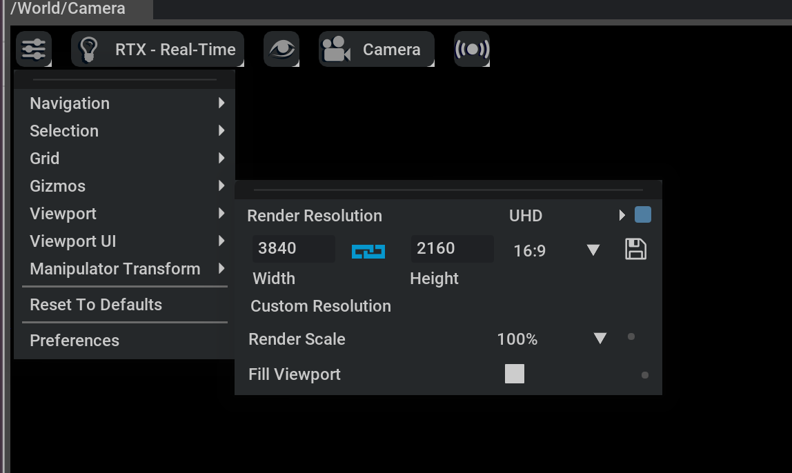 To render the frames from the camera, switch the default viewport (which is a render product itself) to the camera prim that you just created. Select the video icon at the top of the viewport window and then select the camera prim you just created under the