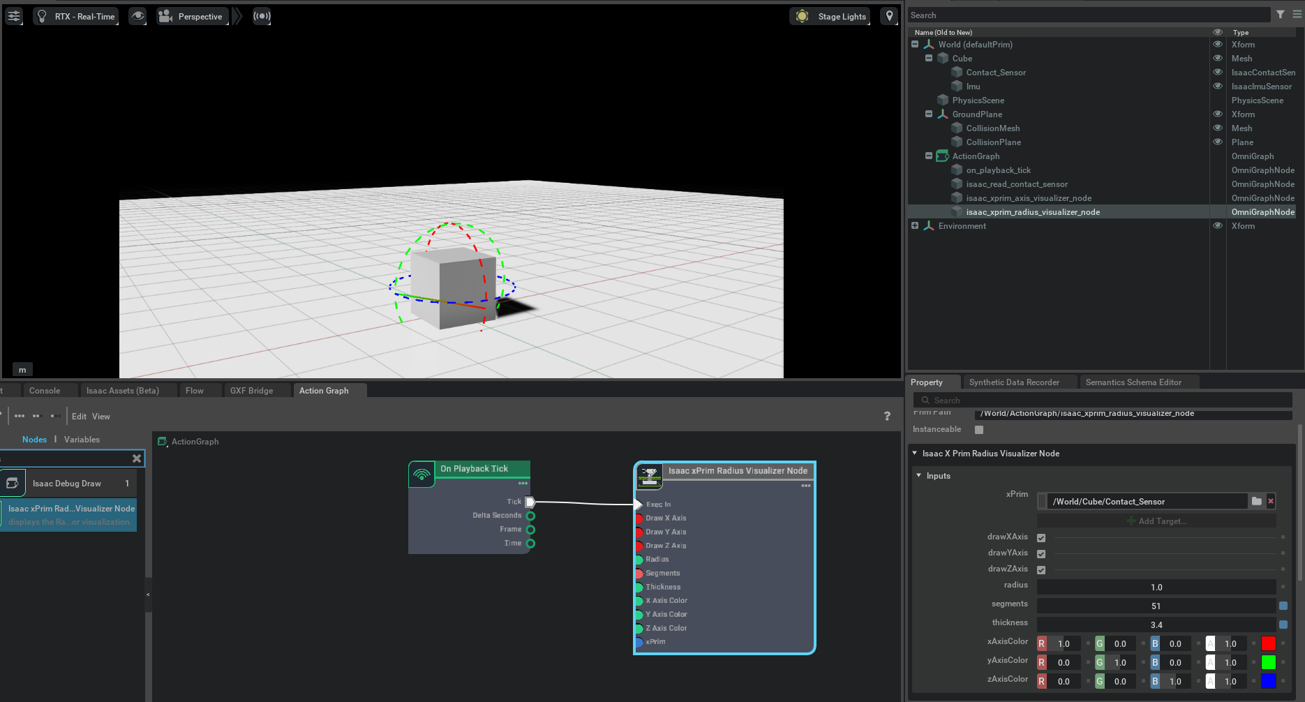 The Contact sensor position and radius can be visualized using the Isaac xPrim Radius Visualizer Node, connect the xPrim input to the Contact Sensor Prim, connect Tick to Exec in. Then insert the correct radius and configure the desired color and line thickness visualization, and the Contact sensor will be visible on PLAY.