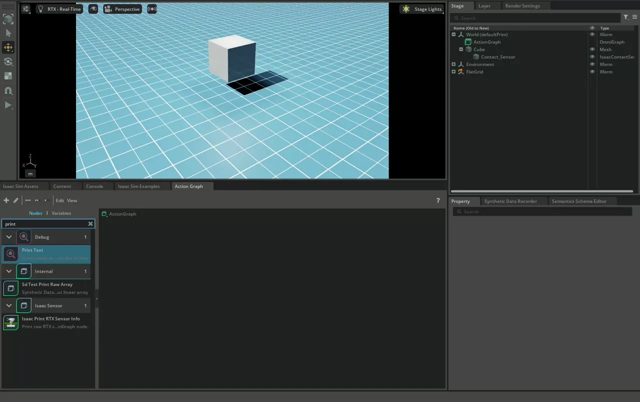 Isaac Read Contact Sensor: Reads the contact sensor. In the Property tab, set Contact Sensor Prim to /World/Cube/Contact_Sensor to point to the location of the contact sensor prim.