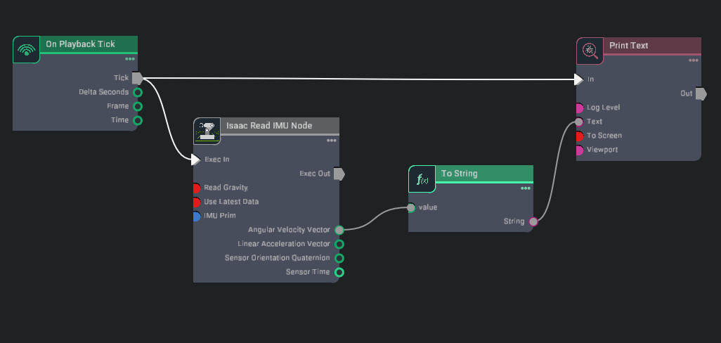 Connect the above nodes as follows to print out the IMU sensor reading: