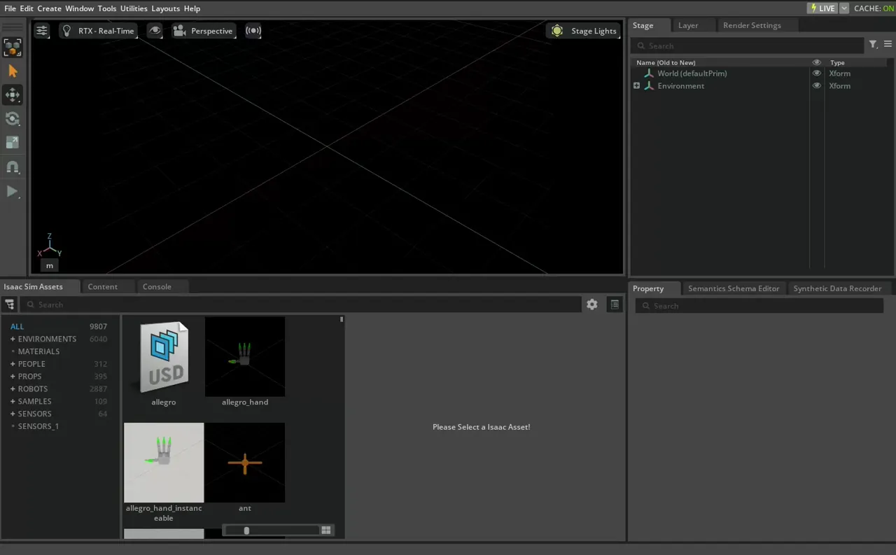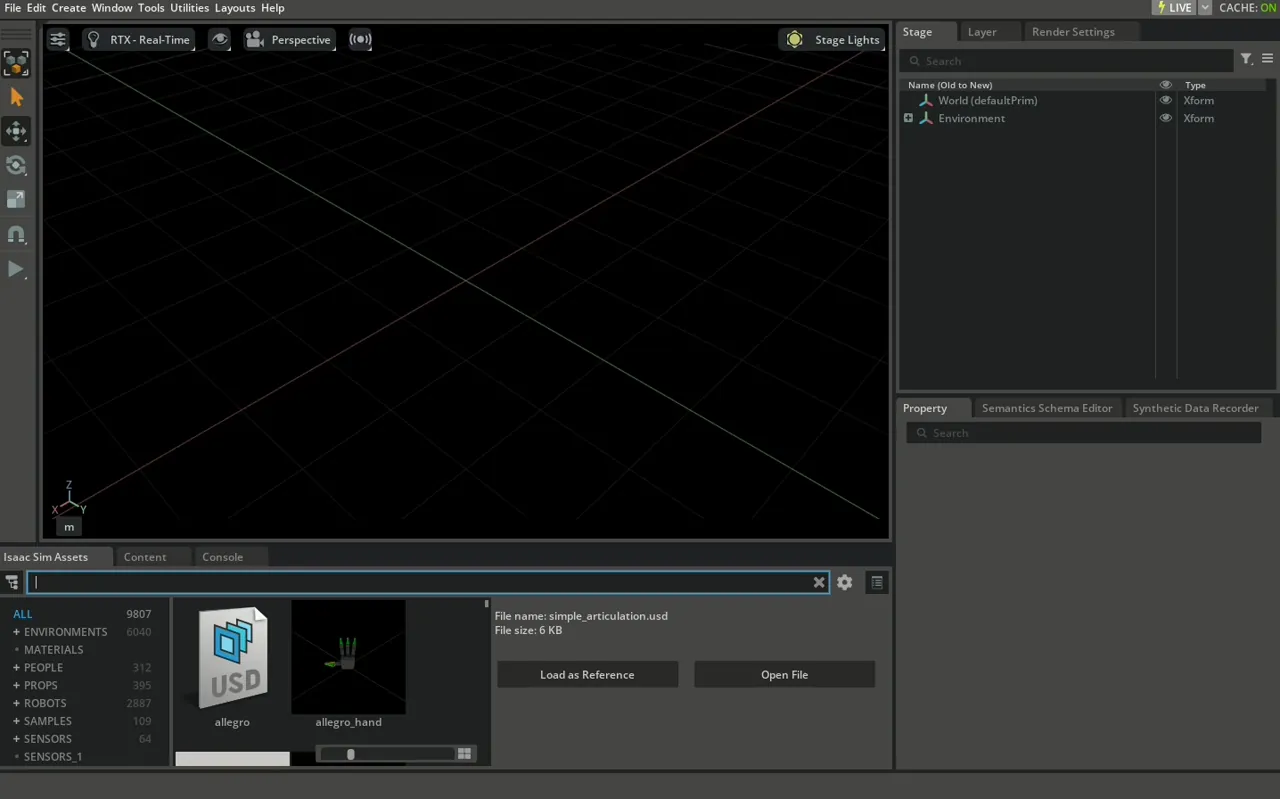 Begin by adding a Simple Articulation to the scene. The articulation file can be accessed through a Omniverse Nucleus server in the content window. Connecting to this server allows allows you to access the library of Isaac Sim robots, sensors, and environments.
