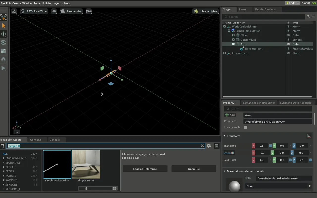 Robots/IsaacSim/SimpleArticulation/simple_articulation.usdin the Content Browser.Drag