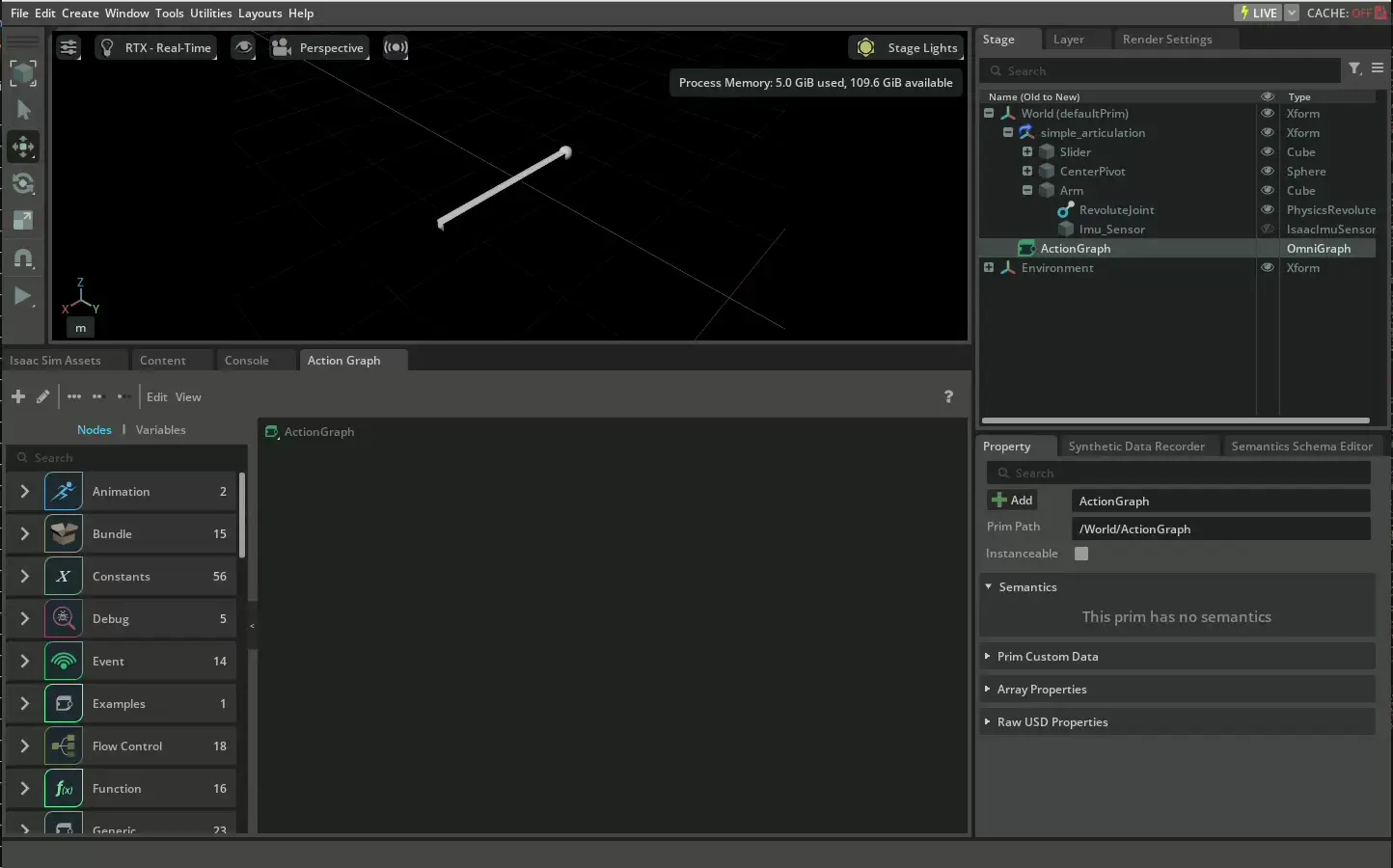 Isaac Read IMU Node: Reads the IMU sensor. In the Property tab, set IMU Prim to /World/simple_articulation/Arm/Imu_Sensor, to point to the location of the IMU sensor prim. Select read gravity to read gravitational acceleration.