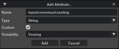 Attributes may be added to materials from the UI by right-clicking the material in the Stage window, then selecting Add > Attribute. This will open a new window like the one below, enabling you to specify custom non-visual attributes.