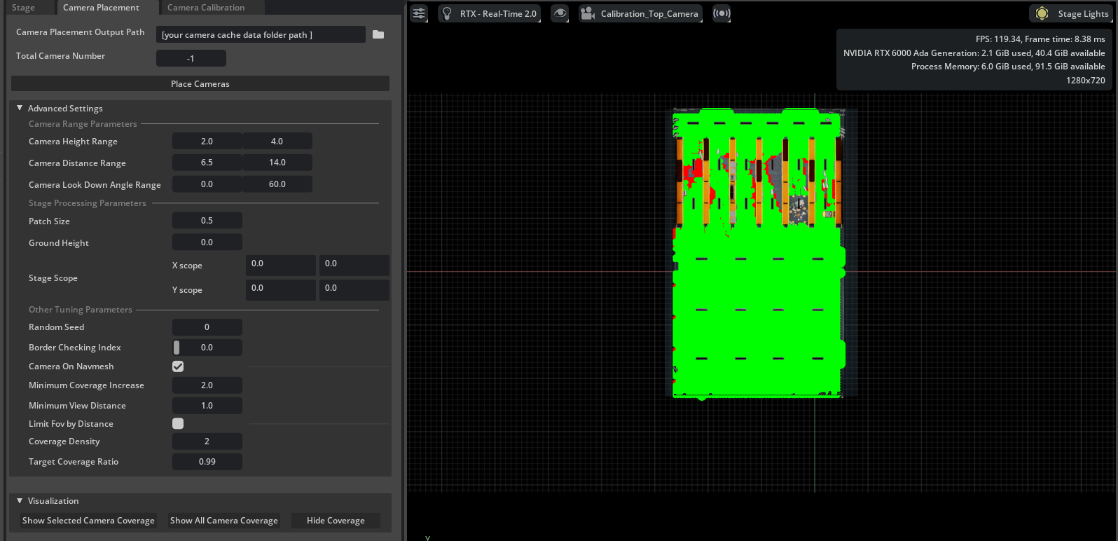 The Camera Placement Tool (isaacsim.sensors.rtx.placement extension) automatically optimizes camera placement in a stage according to user customized requirements.