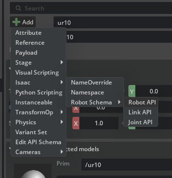 All robots in Isaac Sim’s library and imported through URDF Importer Extension and MJCF Importer Extension will have the Robot Schema applied to them. For robots imported in prior versions of Isaac Sim, the schema will need to be applied manually. To do so, select the root prim of the robot, and in the right panel under the Properties tab, check the + Add button, and select Isaac -> Robot Schema -> Robot API. This will apply the robot schema to the root prim, and will automatically apply the Link API and Joint API to the child prims.