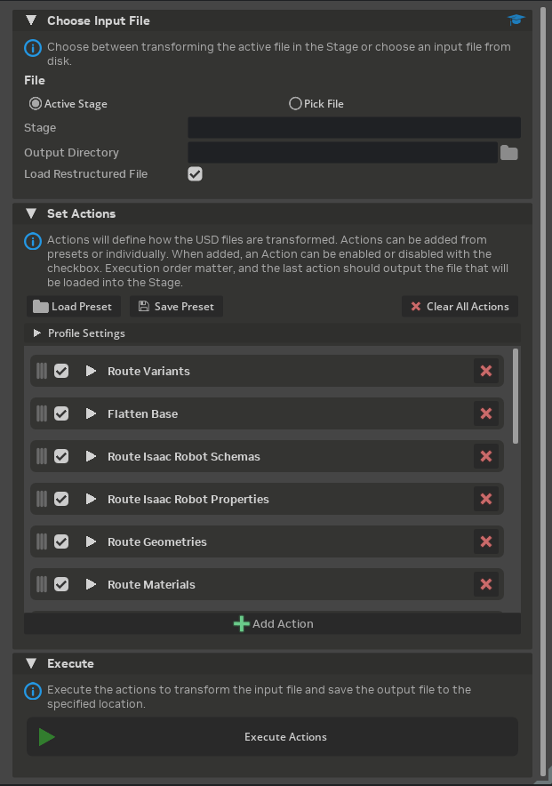 Execute Actions: Run the transformation pipeline. The button is enabled when at least one action is enabled and an output directory is set.