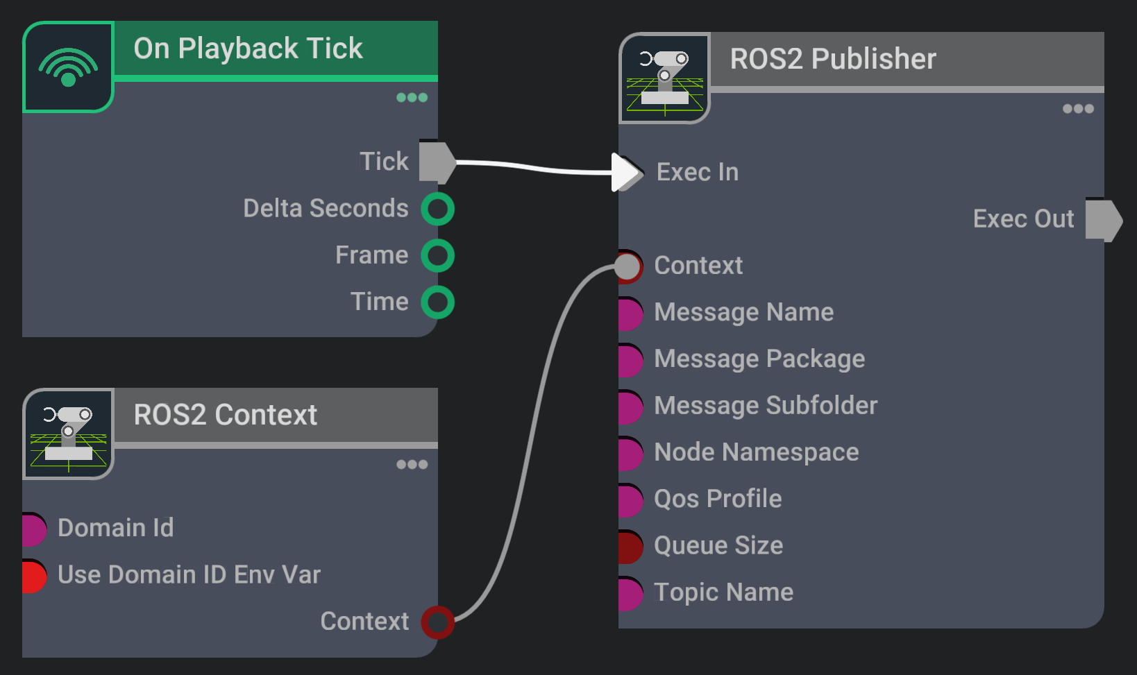 While filling out the ROS 2 Publisher or Subscriber OmniGraphs, if you observe an error such as AttributeError: 'NoneType' object has no attribute 'GetAttributeAtPath', please continue to fill out the remaining fields. After correctly filling out the remaining fields, the error should be resolved automatically and the autogenerated fields should appear.