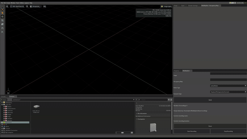 Record a Trajectoryabove, but selectRandomPathFollowingScenarioinstead ofKeyboardTeleoperationScenario. - You no longer need to manually teleoperate the robot. When the scenario is built, it will run and reset automatically. - You do need to hit “start recording” to enable recording to disk. However, when the scenario resets, a new recording will be created automatically. - Verify that you have recordings collected in the~/MobilityGenDatafolder the same as above.Follow
